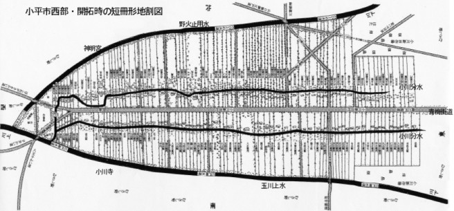 小平市は、自然の河川が近くになく水を得ることが難しい地域だったことから、農業に向かず、集落などもあまり見られない環境でした。こうした状況の中、玉川兄弟の指揮により江戸時代に玉川上水が引かれると、周辺の土地へ用水路を引いて農業用水や生活用水を確保できるようになり、市内を東西に走る青梅街道や五日市街道、また主要な用水などに対し、南北に細長い形で地割りが行われ農地が開拓されました。その結果、宅地化が進む状況においても南北に長い短冊状の農地が残り、宅地と農地が縞模様のように残る特有の景観をつくり出しています。