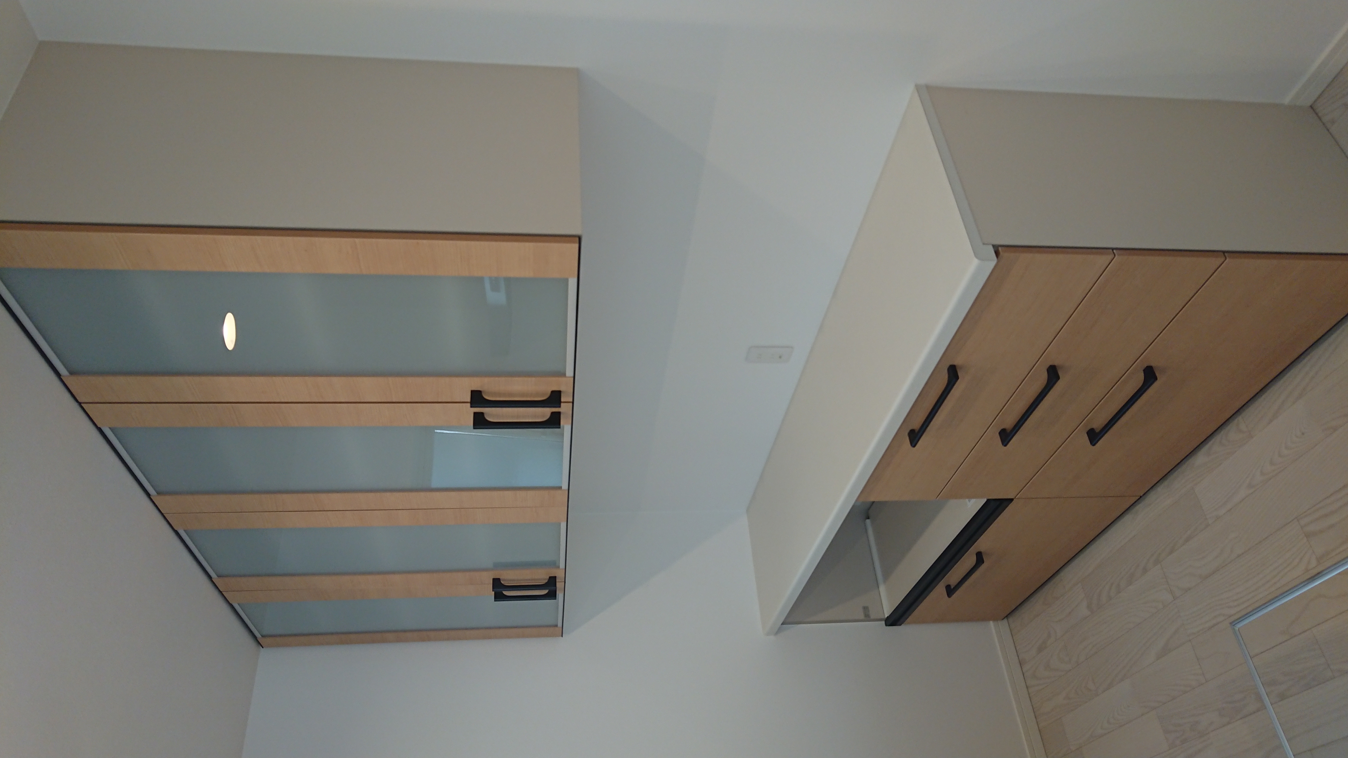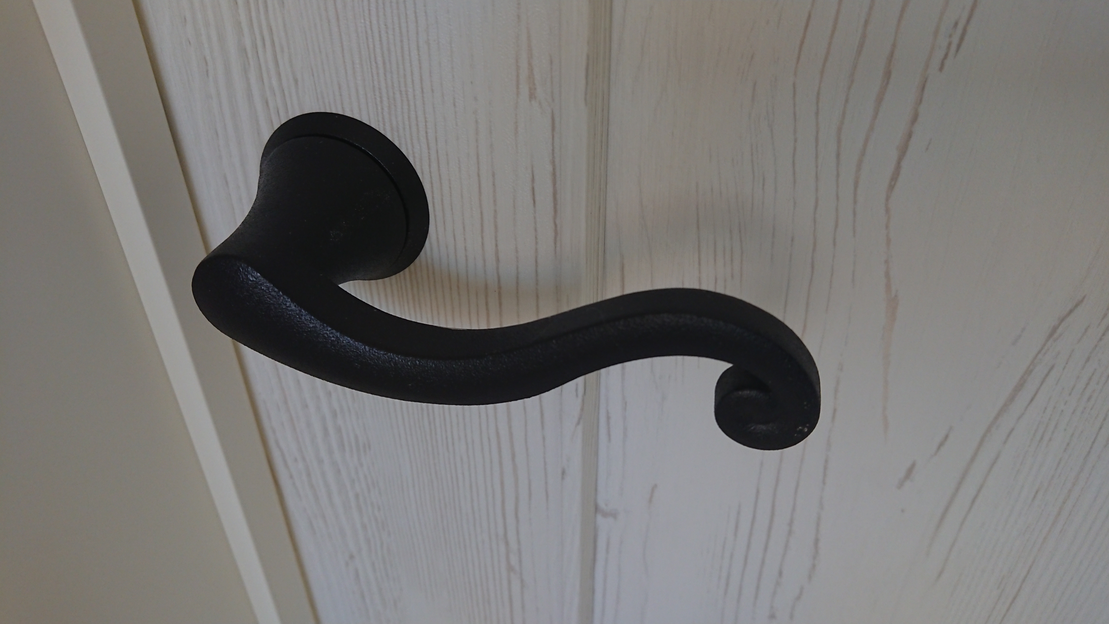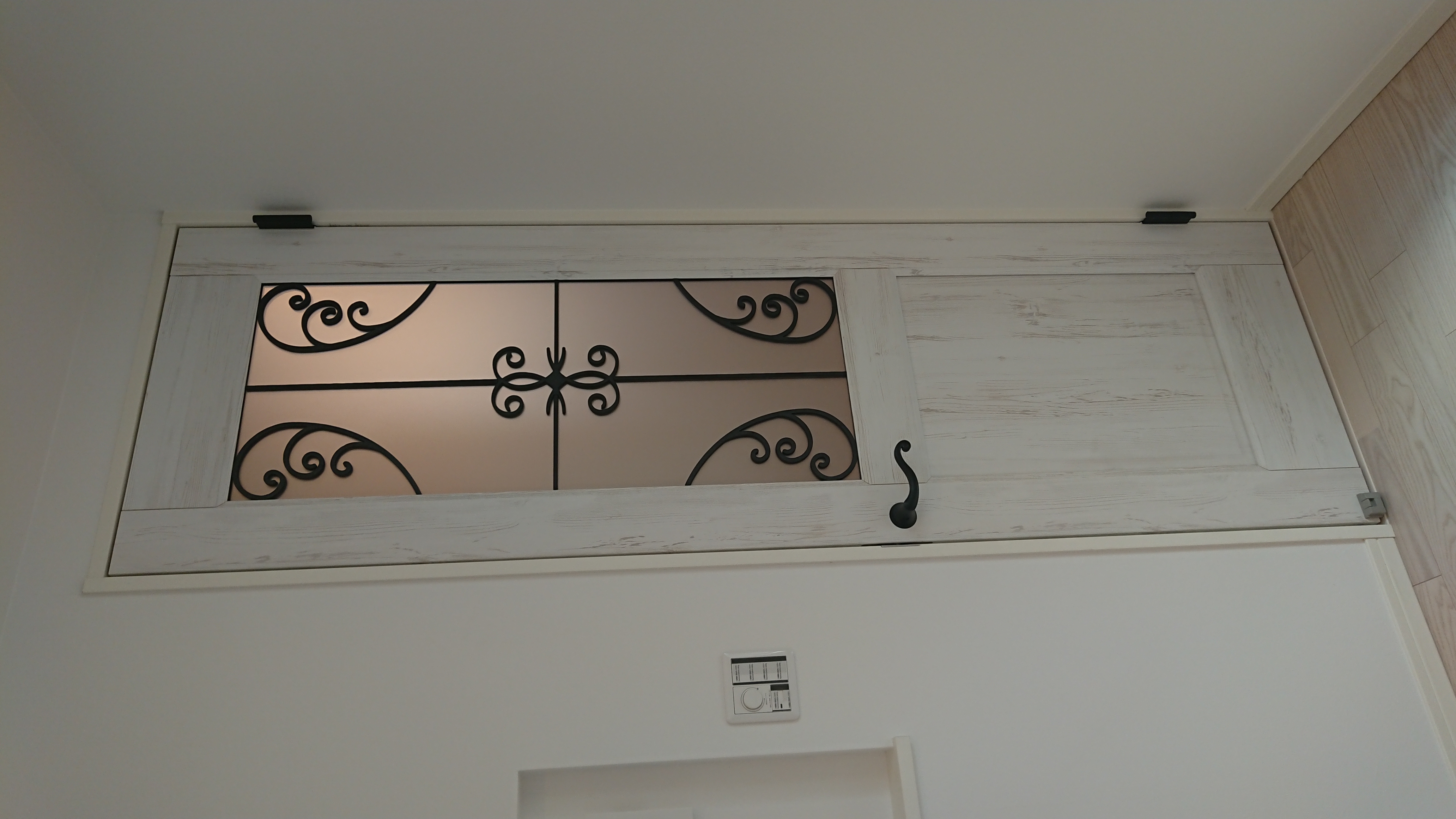 今回の仕様では、玄関ドアとリビングドアのアイアンを施した飾り窓を採用し、また取っ手もアイアン調の取っ手とすることで、アンティークで落ち着いた雰囲気を醸し出しています。
